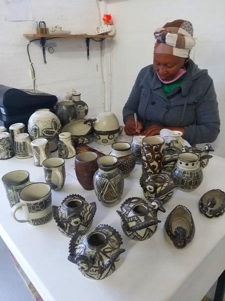 Women were recruited in the pottery workshop to make hand-built coiled ware, drawing on their local traditions (eg Dinah Molefe who was an accomplished beer-potter from the adjoining Nqutu district- was first recruited as a handbuilder to coil pots). In all, the Pottery Workshop has employed some nineteen potters in over forty years of existence. As potters drew both from both local Zulu traditions and Sotho ones, this conflation resulted in the retention of certain features, such as the use of Sotho derived slips (to be carved into).