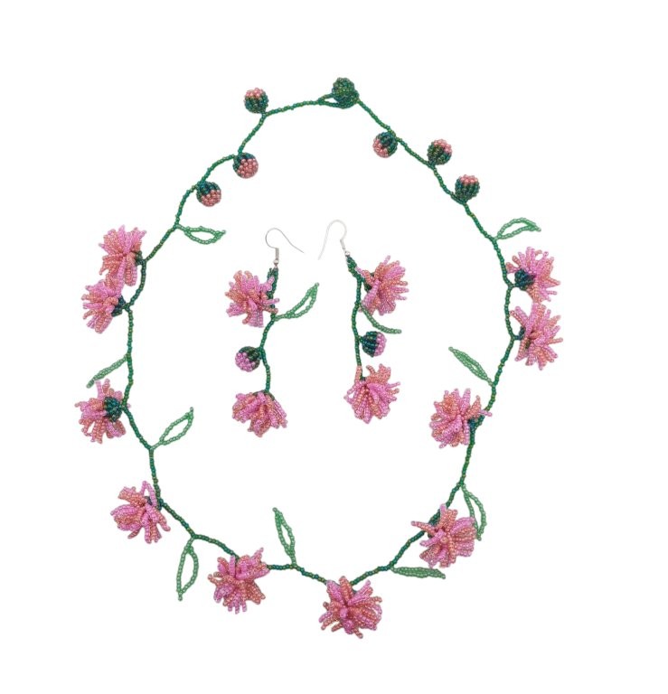Recently, we had the opportunity to showcase our beadwork at Nirox as part of the Cape Insights Art Tour, where we met a group of American art enthusiasts. During our tour of the Cradle of Humankind, we learned about the invasive pompom weed, a species that threatens the survival of grasslands and wetlands across South Africa. Inspired by this experience and in collaboration with Sheila Majola, we designed a striking necklace and earring set featuring our signature beadwork.