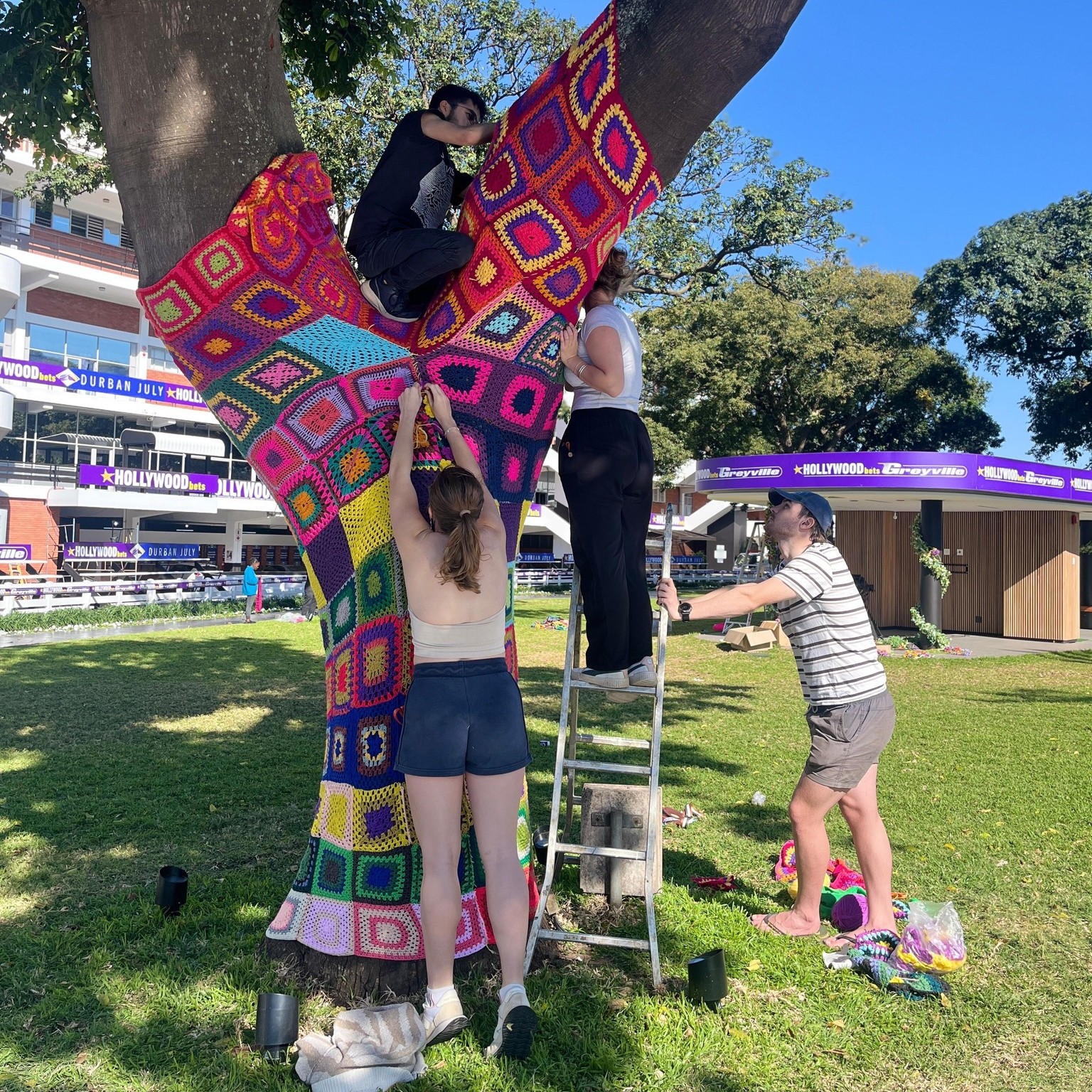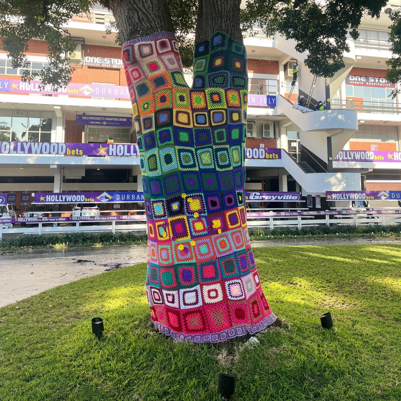 Woza Moya had the privilege of being part of the Durban July this year. Instead of glamour, we arrived with something different, we wrapped a few of the trees at the venue in crocheted yarn squares. It was a big project, full of planning, stitching, and coordination, but seeing it come together made all the effort worthwhile.