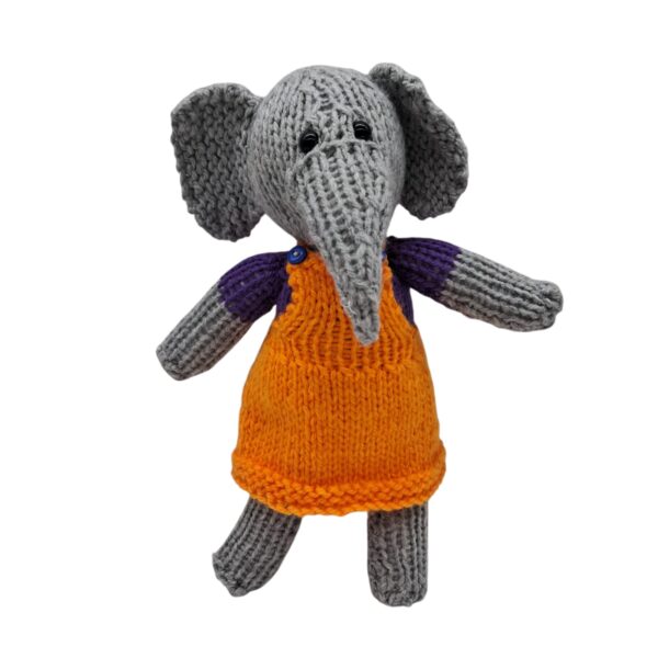 Buy cute little knitted animals at Woza Moya, this one is an elephant dressed in Orange created by 7 Rivers Outreach