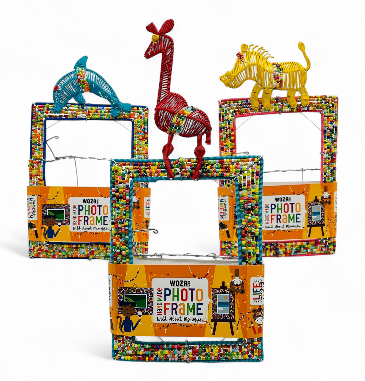 These colorful A5 photo frames are handcrafted using a sturdy wire base wrapped in vibrant beads and smooth, flexible “scoobie” piping. Each frame features a dense, multi-colored border and is topped with a hand-shaped wire animal, such as a giraffe, dolphin, or warthog. Designed to stand upright, these frames provide a bold, textured way to display your favorite photos with a bright pop of personality.