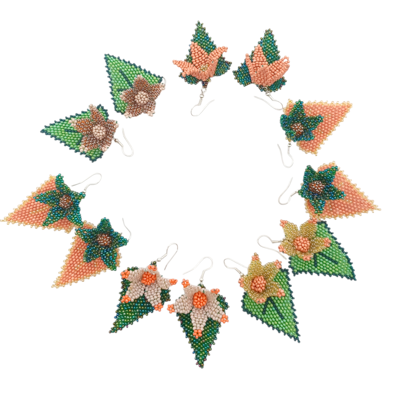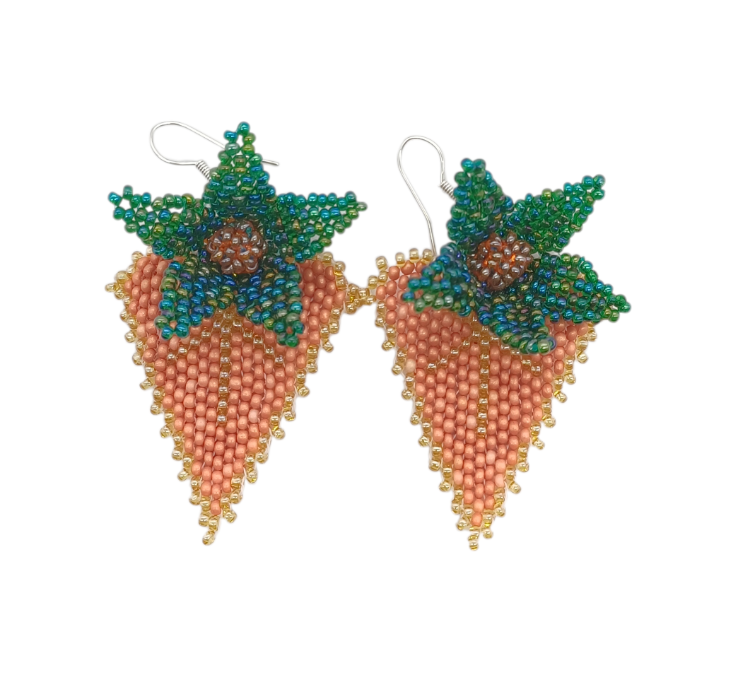 These handcrafted beaded earrings are inspired by the rich tones of autumn. Deep green petals with a warm brown centre sit above a soft peach leaf-shaped drop, finished with delicate golden edging for added detail. Lightweight yet bold, they move beautifully and add a striking pop of colour to any outfit — a true celebration of intricate Zulu beadwork. Available in various autumn shades.