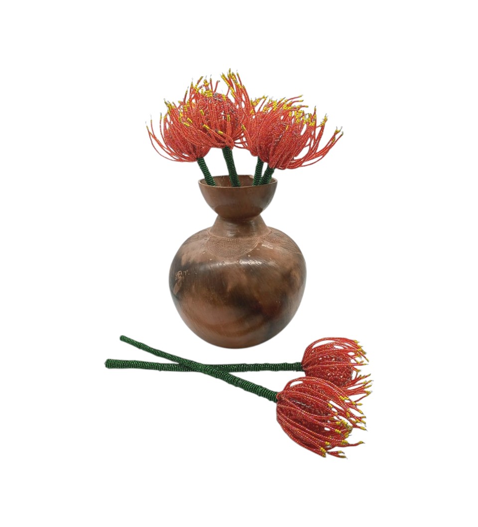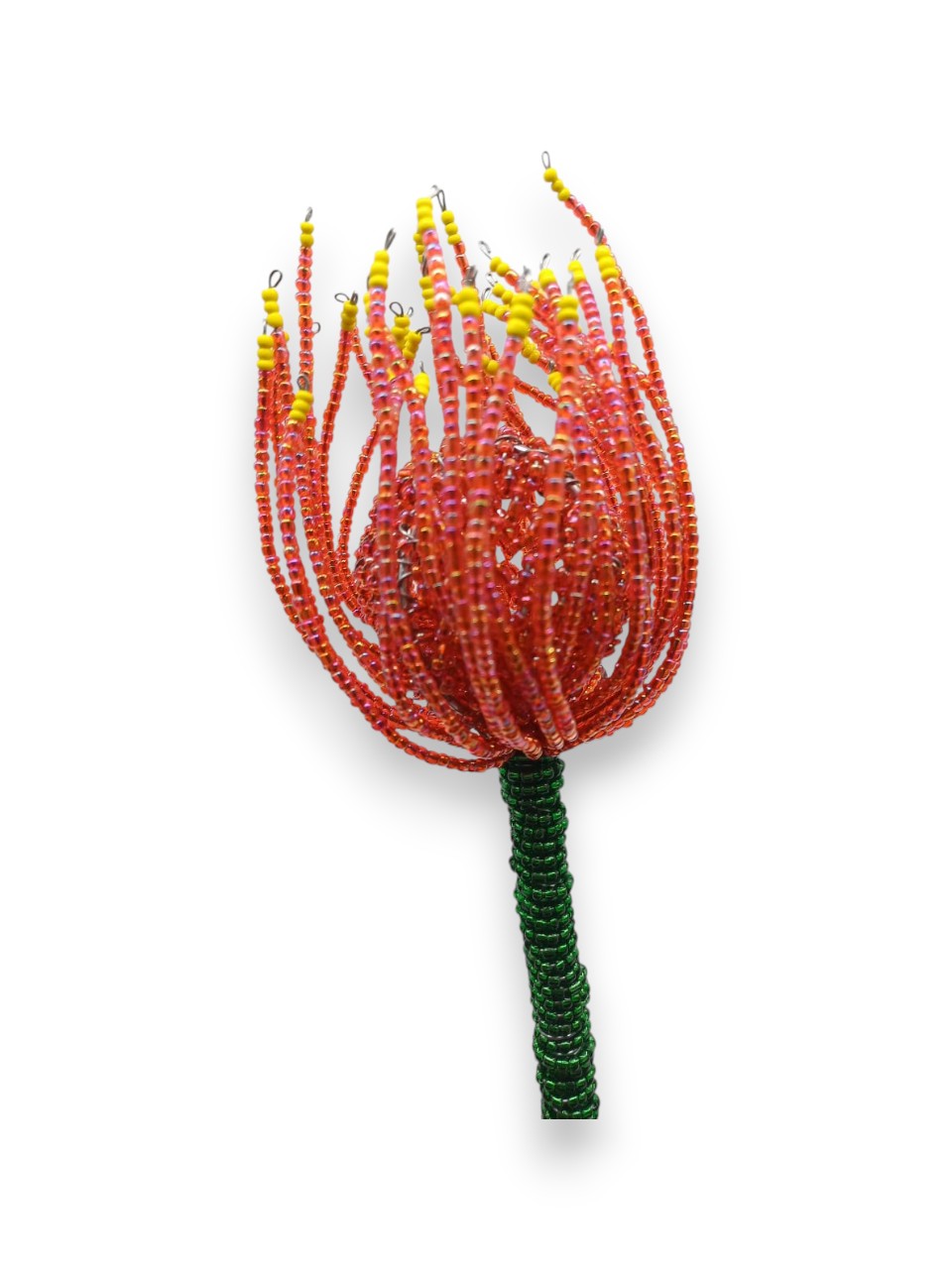 Our Beaded Pincushion Protea captures the beauty of one of Mzansi’s most iconic flowers. Each flower is carefully handcrafted using glass beads and wire, inspired by the real pincushion protea (Leucospermum). Perfect for home decor. gifts, or event displays. 41cm in Length x 8cm in width x 8cm in Height.