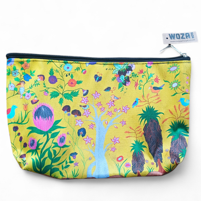 Keep your essentials organized in a burst of sunshine with the Garden of South African Eden small pouch. Measuring 27cm x 17cm, this versatile accessory is perfectly sized to serve as a vibrant cosmetic bag or a whimsical pencil case. The golden yellow canvas is alive with the charm of the local wild, featuring the iconic King Protea, playful birds, and intricate floral details that turn a simple storage solution into a pocket-sized masterpiece. Finished with a sturdy black zipper, it is a practical and beautiful way to carry the spirit of South African artistry with you every day.