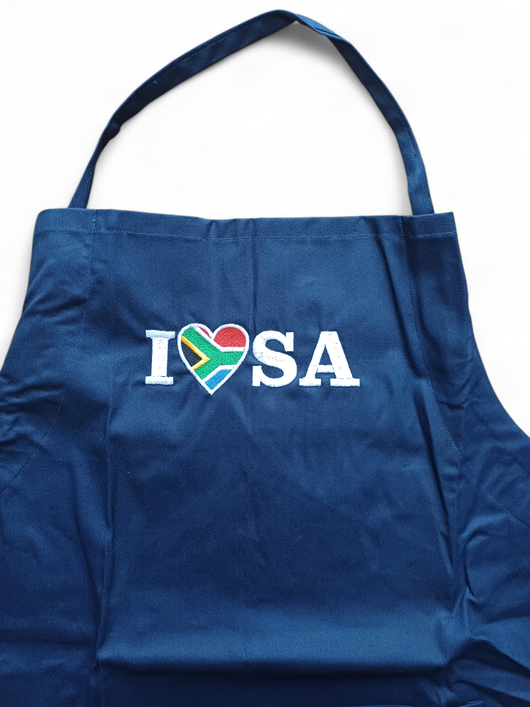 Traditional apron with I love SA logo – stylish, meaningful, and proudly South African. Perfect for gifting or everyday use.