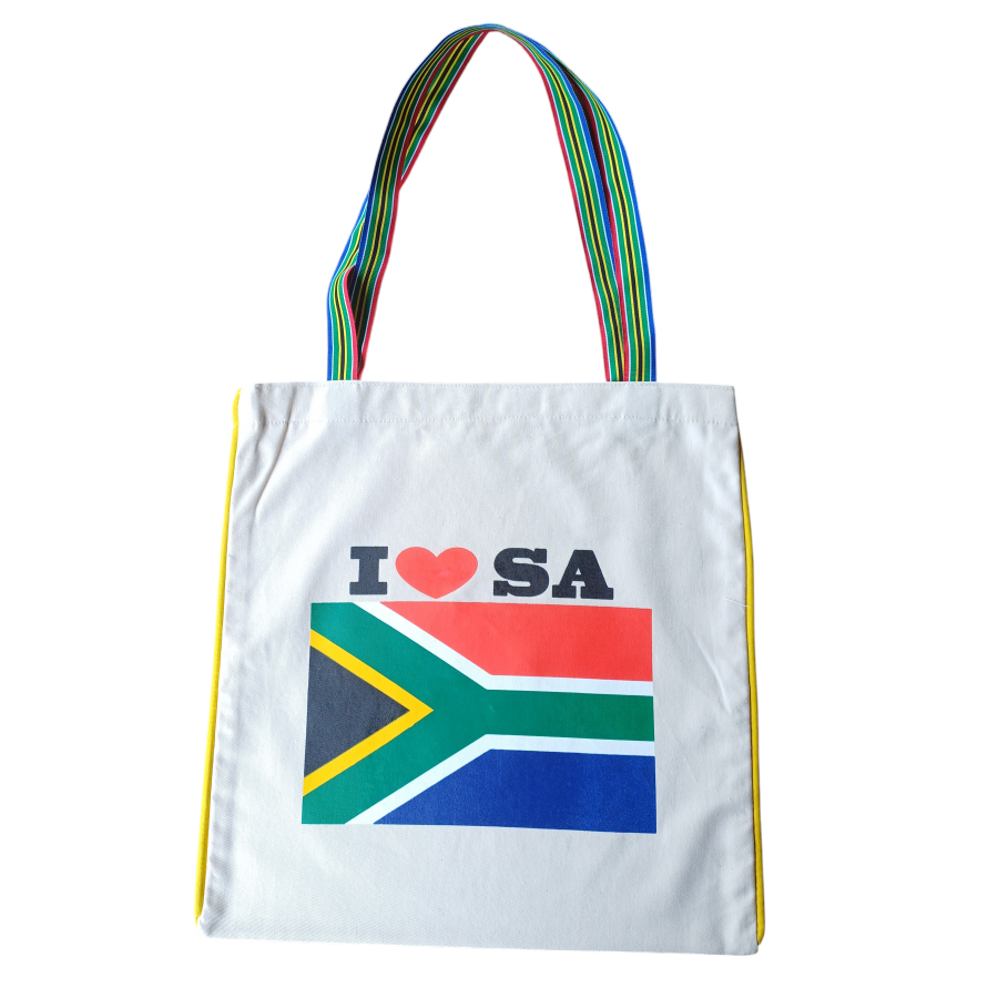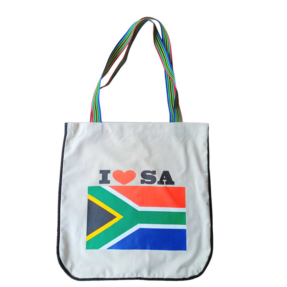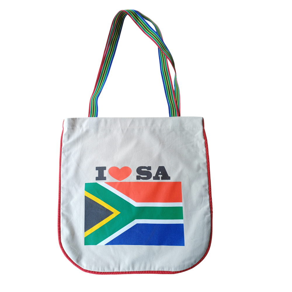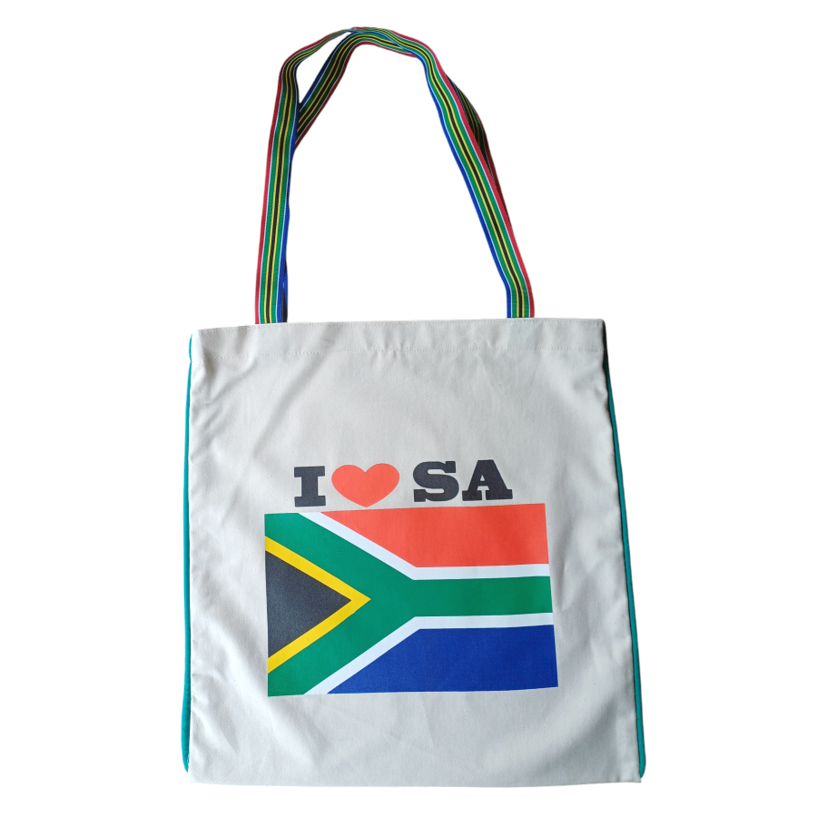The bag has a “I love SA ” and South African Flag print, with a bright stripey strap in the South African flag colours. Bags are trimmed with piping in various colours to pick up one of the colours in the flag.