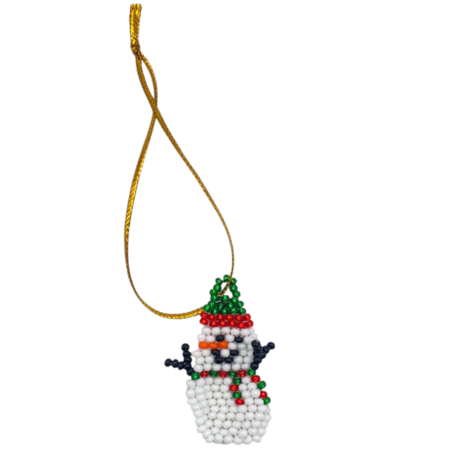 Beaded snowman decoration with a green hat, carrot nose and stick arms. (4cm x 2.5cm x 0.2cm)