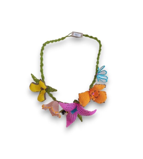 A handcrafted beaded floral necklace featuring detailed, hand-beaded flowers and rich colour. A bold yet delicate statement piece and a true example of wearable art.