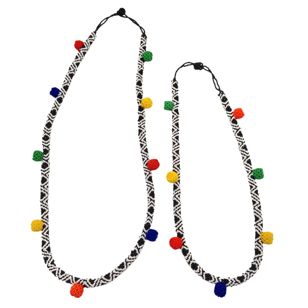 Bright beaded pom-poms on a beaded black and white tubular necklace.