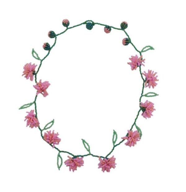 The flower necklace is made of a weed flower. The plant in the picture appears to be Thalictrum aquilegiifolium, commonly known as meadow rue. It’s known for its fluffy, pom-pom-like flower clusters, usually in shades of lavender, pink, or purple, and is often found in woodlands or moist meadows. The fine, feathery appearance of the flowers is due to their numerous stamens.