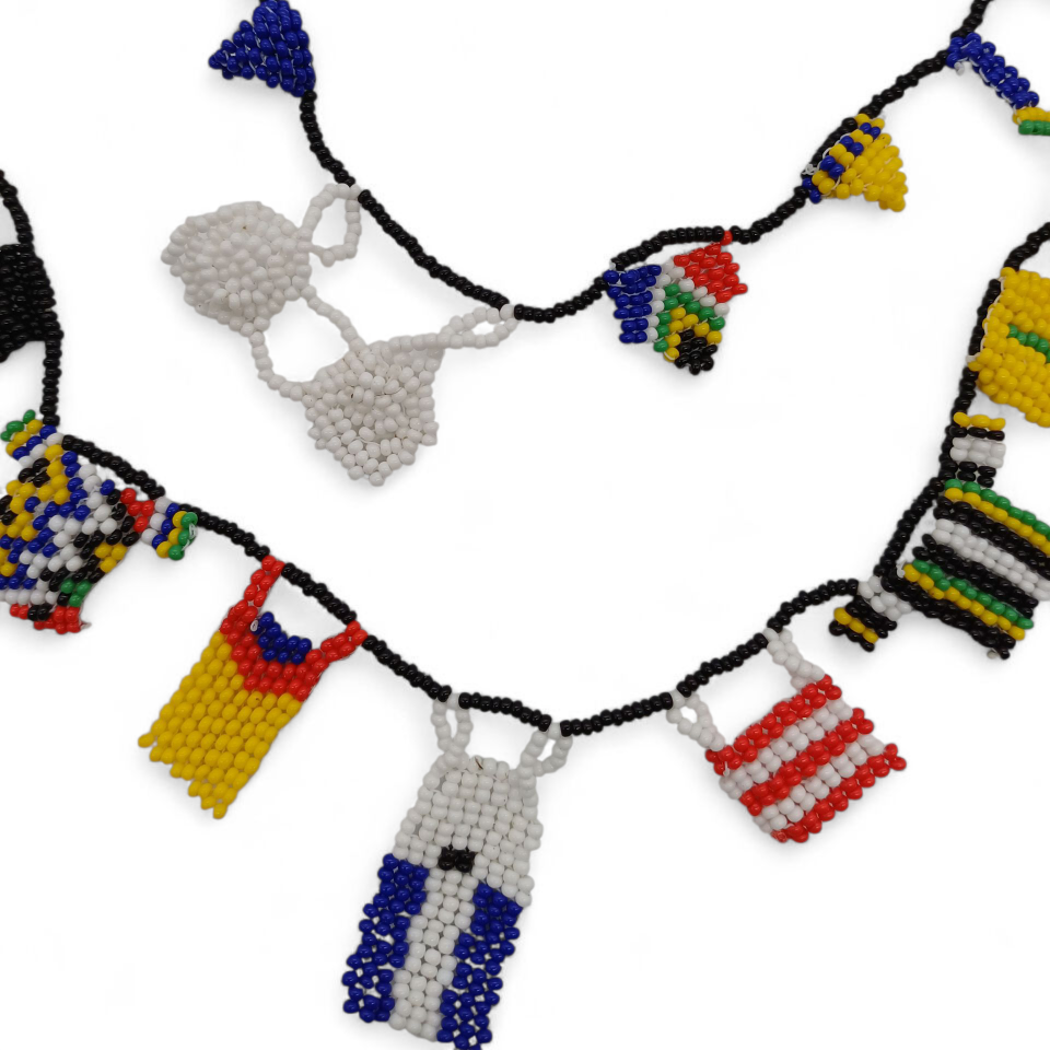 Playful necklace featuring miniature beaded clothing on a washline, inspired by South African style. Each piece is made from colorful beads in South African flag tones and local design motifs. The necklace is lightweight, detailed, and designed to celebrate everyday life with a touch of humor and cultural pride.