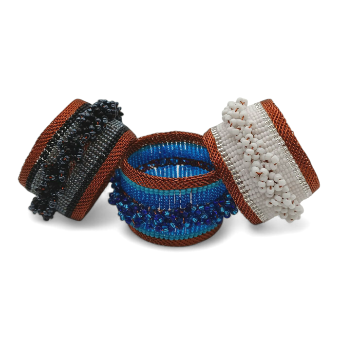Our beaded serviette rings, crafted from copper wire and beads. Perfect for adding a stylish, proudly South African flair to your dining table at dinner parties, celebrations, or everyday mealtimes. Beautiful, functional, and timeless. 5cm in diameter x 2.5cm in height.