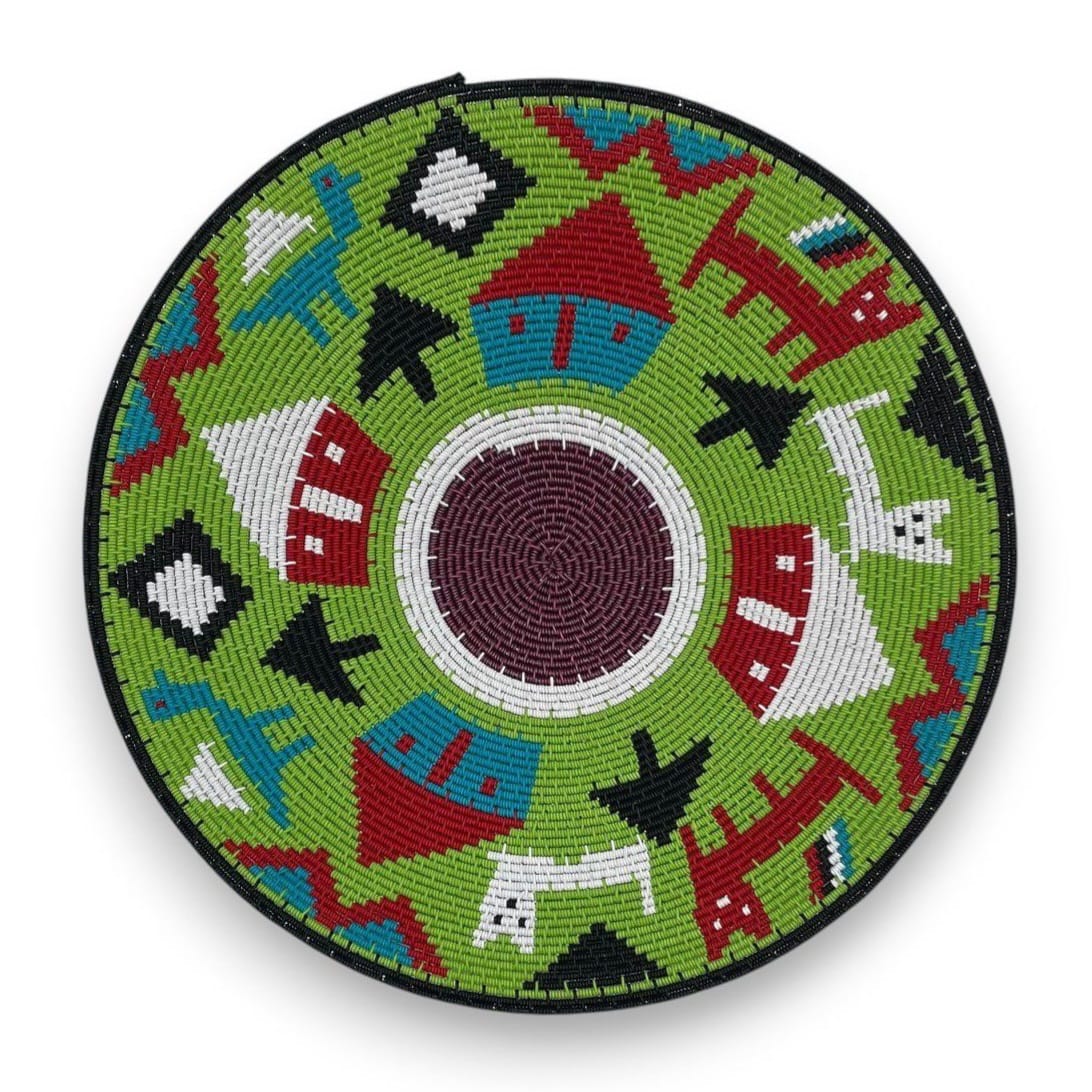 29.5 cm shallow hardwire story bowl depicting rondavels and animals on a green background.