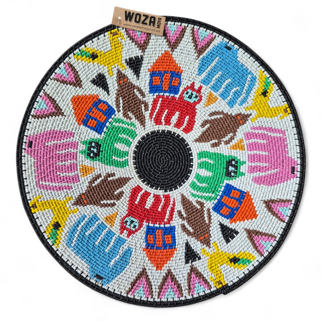 Shallow hardwire bowl with a white background and black border. The bowl features animals and Zulu huts in vibrant colours.