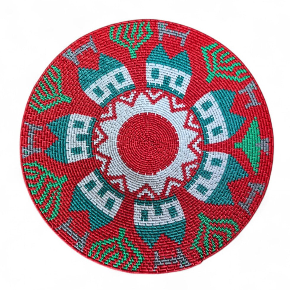 This red hardwire bowl has been woven in a symmetrical pictorial design. Designs are imagined by the crafters and brought to life.