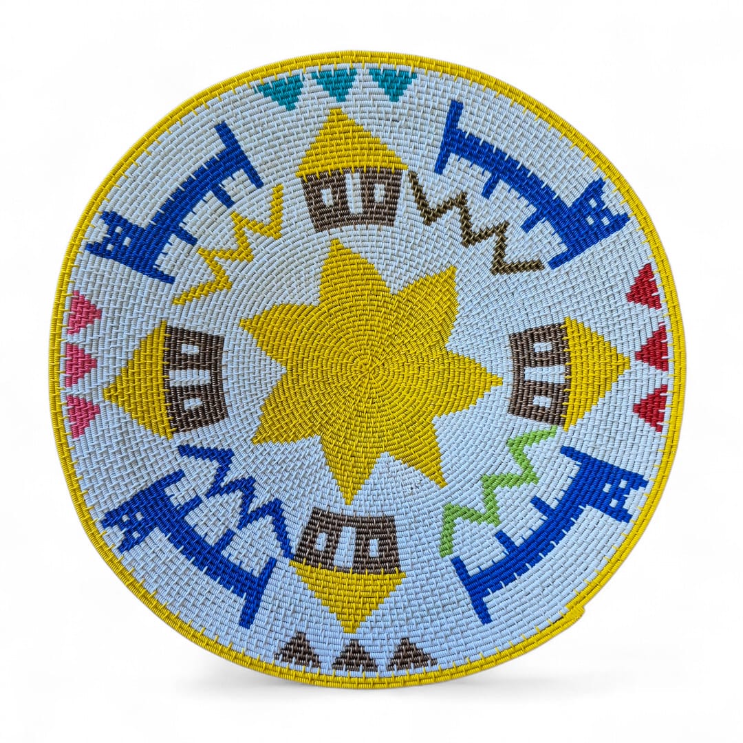 A hardwire coil-weave Zulu story basket in a pictorial design.