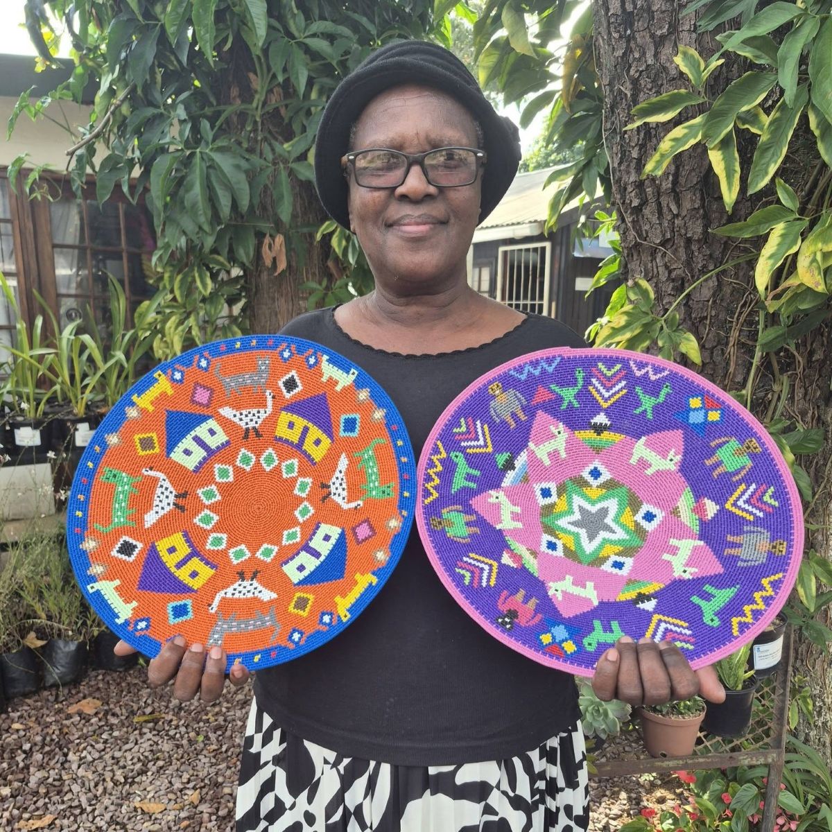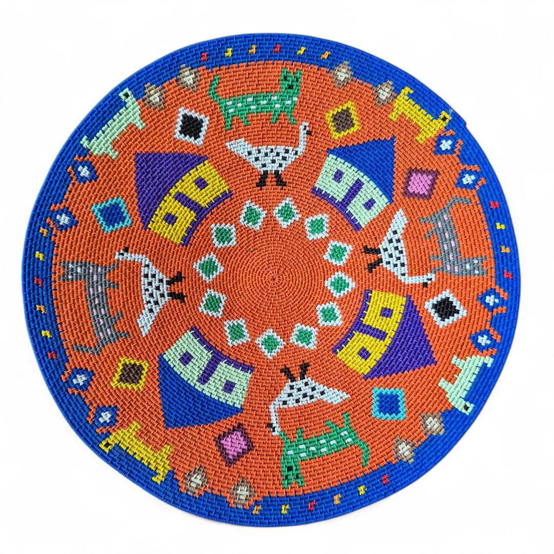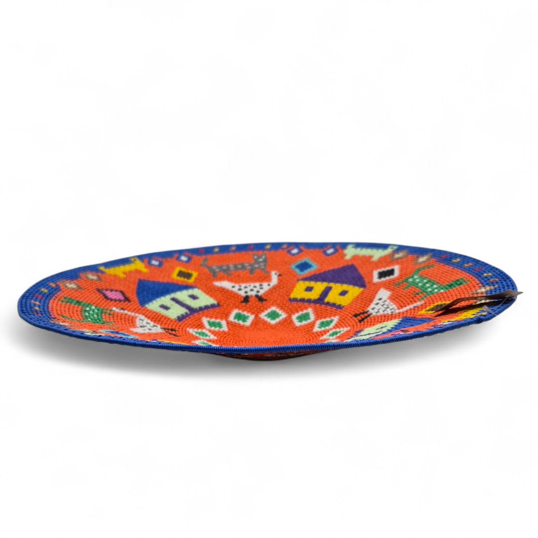 This 36 cm diameter shallow hardwire basket was hand-woven by Tholakele Dlamini. It features Zulu huts and animals on a vibrant orange background.
