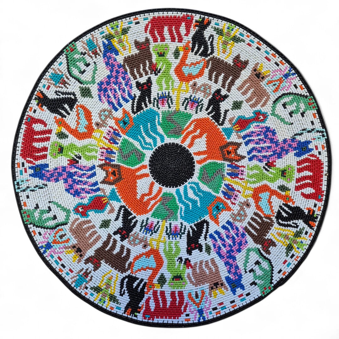 Shallow hardwire bowl with a white background and black border, with the most beautiful animals woven in bright colours.