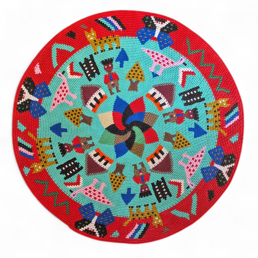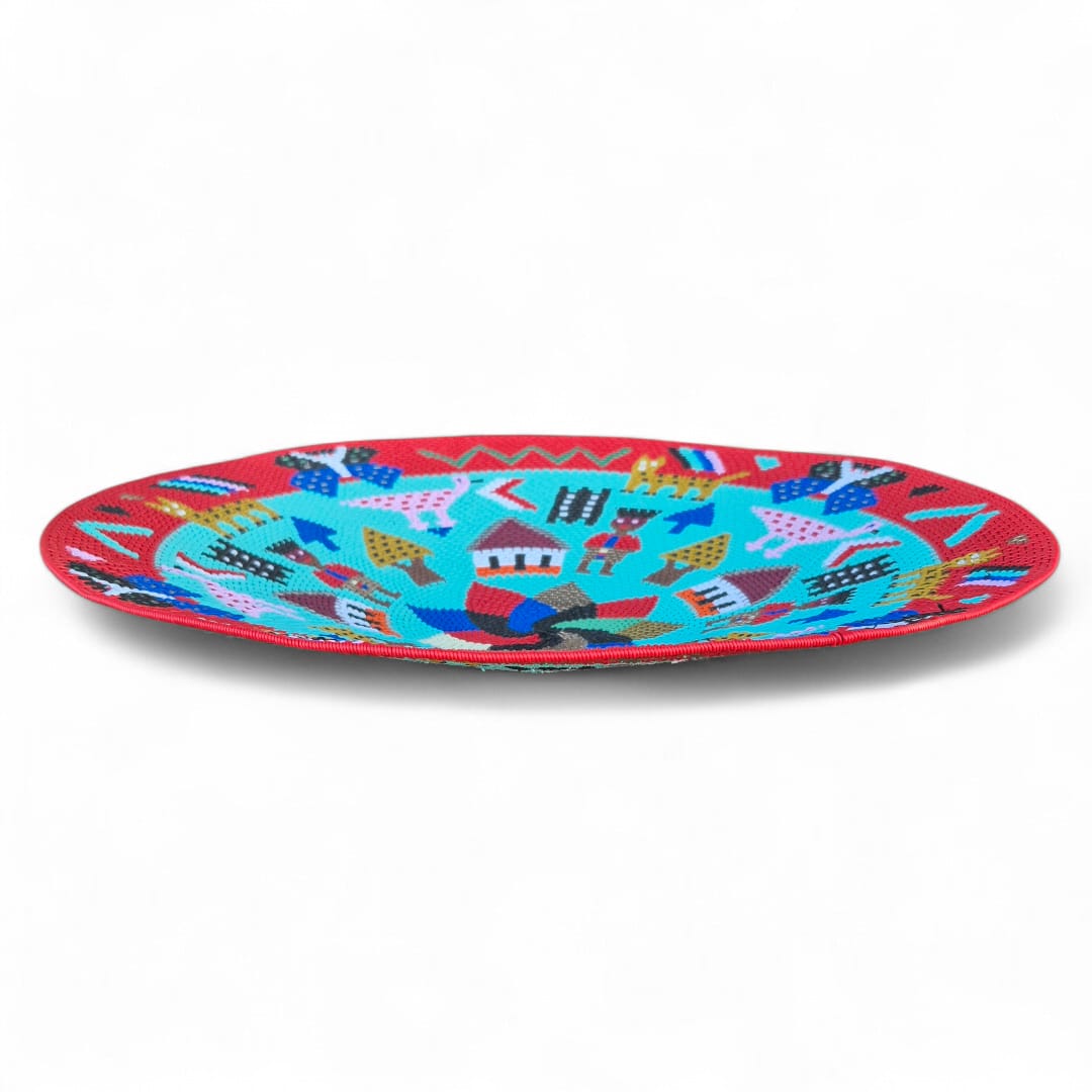 A striking Hardwire Zulu Story Bowl woven by Ntombi Mzolo. Handcrafted in KwaZulu-Natal, South Africa, this 44cm statement basket showcases rondavels, people, birds, animals and butterflies in vibrant colours. The background is turquoise and the bowl features a large red border.