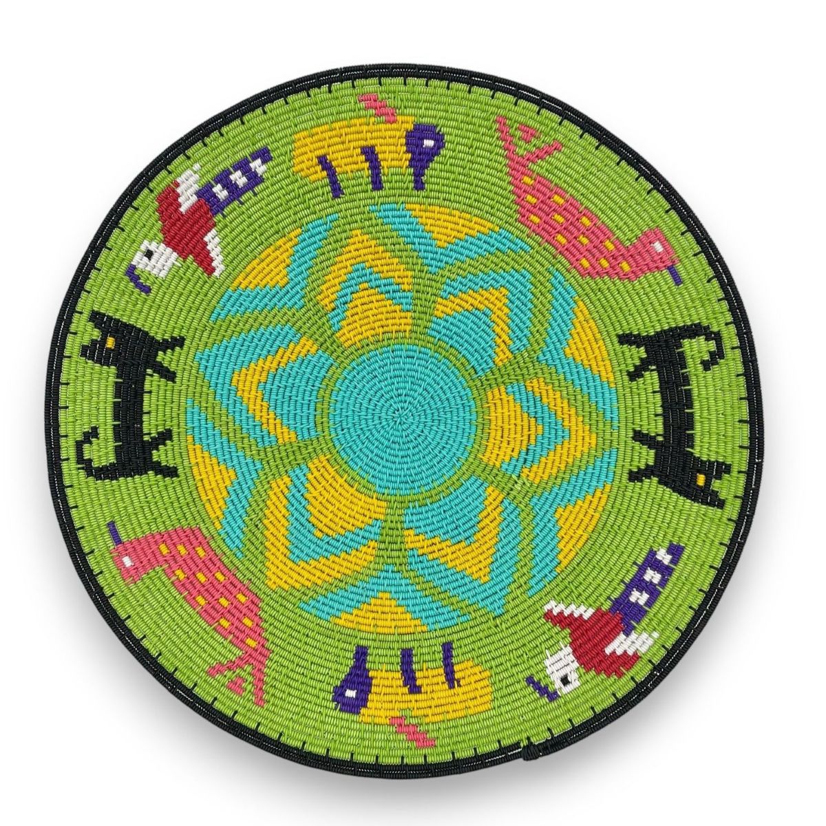 Light green 28.5cm hardwire bowl with a bird and animal design, skillfully woven by Nomvuselelo Mthwalo.