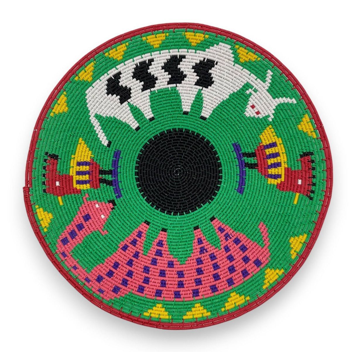 Bright green 28cm hardwire bowl with animals and hoopoe birds, skillfully woven by Nomvuselelo Mthwalo.