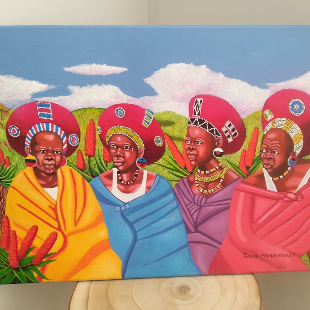 Manana’s work is characterised by bright colours, sensitive light, and strong lines. He draws his inspiration from the reality of the world around him, particularly from rural and township life. His subject matter often includes people engaging in everyday activities like playing music, dancing, or socialising. His work is full of fine detail which draws you in.
