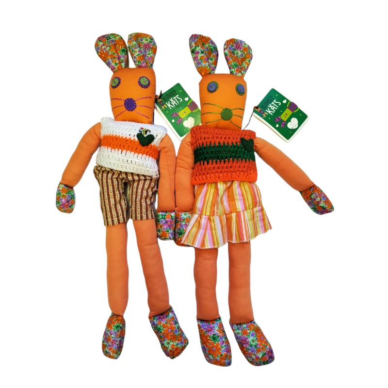 These charming handmade, stuffed toys are created by our Woza Moya crafters and each Bunnykat produced provides an income for at least 4 crafters. One crafter makes the doll, one crochets the vest, one makes the skirts and shorts and a fourth crafter embroiders the face.
