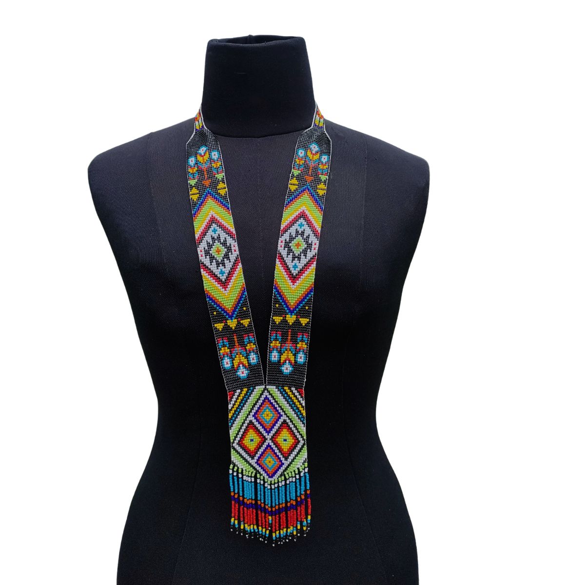 This stunning loom beaded necklace is filled with many vibrant colours in various patterns. Wear this at your next formal event to take your outfit to the next level or wear it casually to liven up your daily outfits.